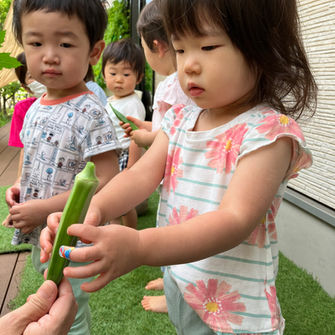 園庭に小さな畑があり、そこで季節の野菜を育てています。毎日水やりをして、大きくなったら収穫をします。収穫した野菜は触ったり、子どもたちの目の前で切って匂いをかいだり、野菜スタンプにして形を楽しんだり、実際に食べてみたり・・・五感で野菜を楽しみ、子どもたちが食に興味をもてるような活動を日々おこなっています。